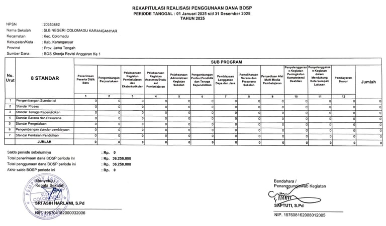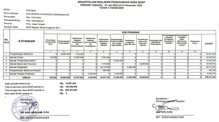 Laporan Penggunaan dana BOSP Kinerja SLB Negeri Colomadu berikut :